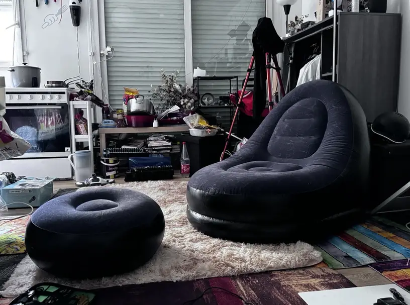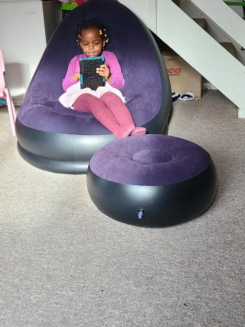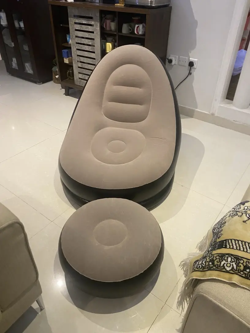 الراحة والاسترخاء: توفر أريكة النفخ مساحة واسعة للجلوس والاسترخاء، مع وسادة مسند للقدم لزيادة الراحة والدعم للقدمين.